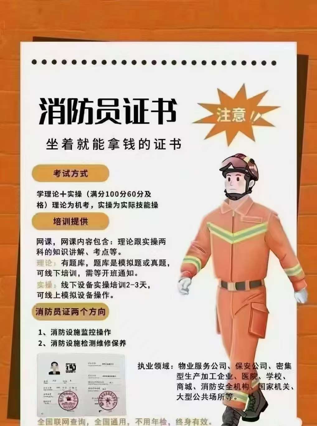 消防设施操作员证是由国家人力资源和社会保障部印制颁发的,证书终身有效,全国通用。消防设施操作员证是由消防特有工种职业技能鉴定中心颁发的,证书上会有中华人民共和国人力资源和社会保障部、公安部消防局(消防行业职业技能鉴定专用章)、消防行业职业技能鉴定指导中心。是消防部门和监控室必备的职业技能证书。